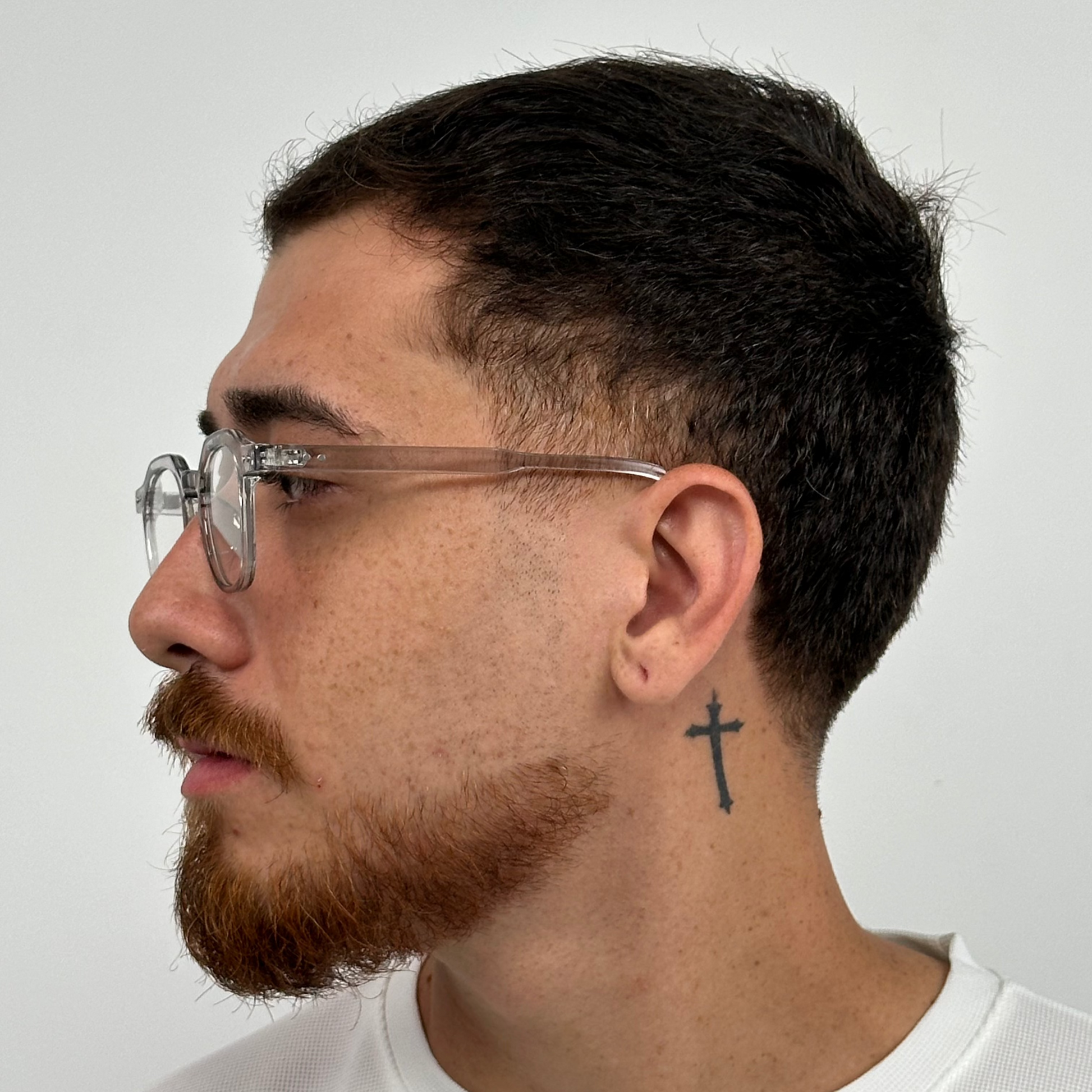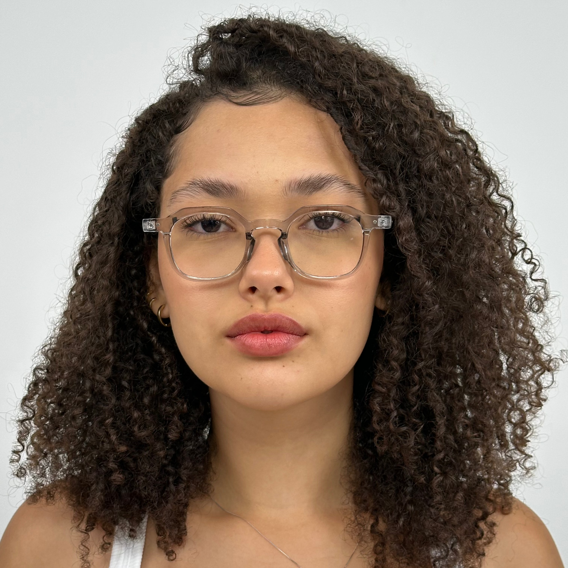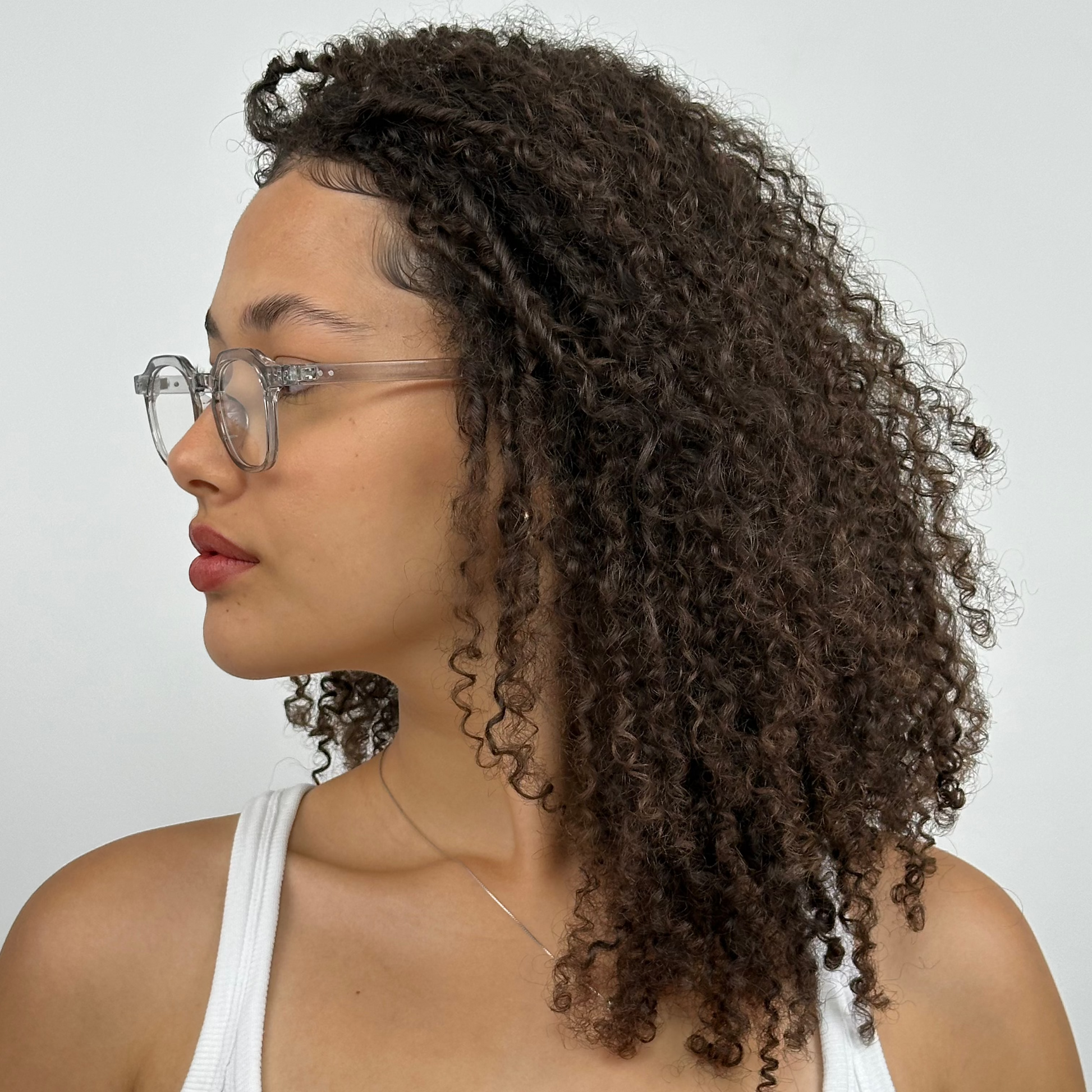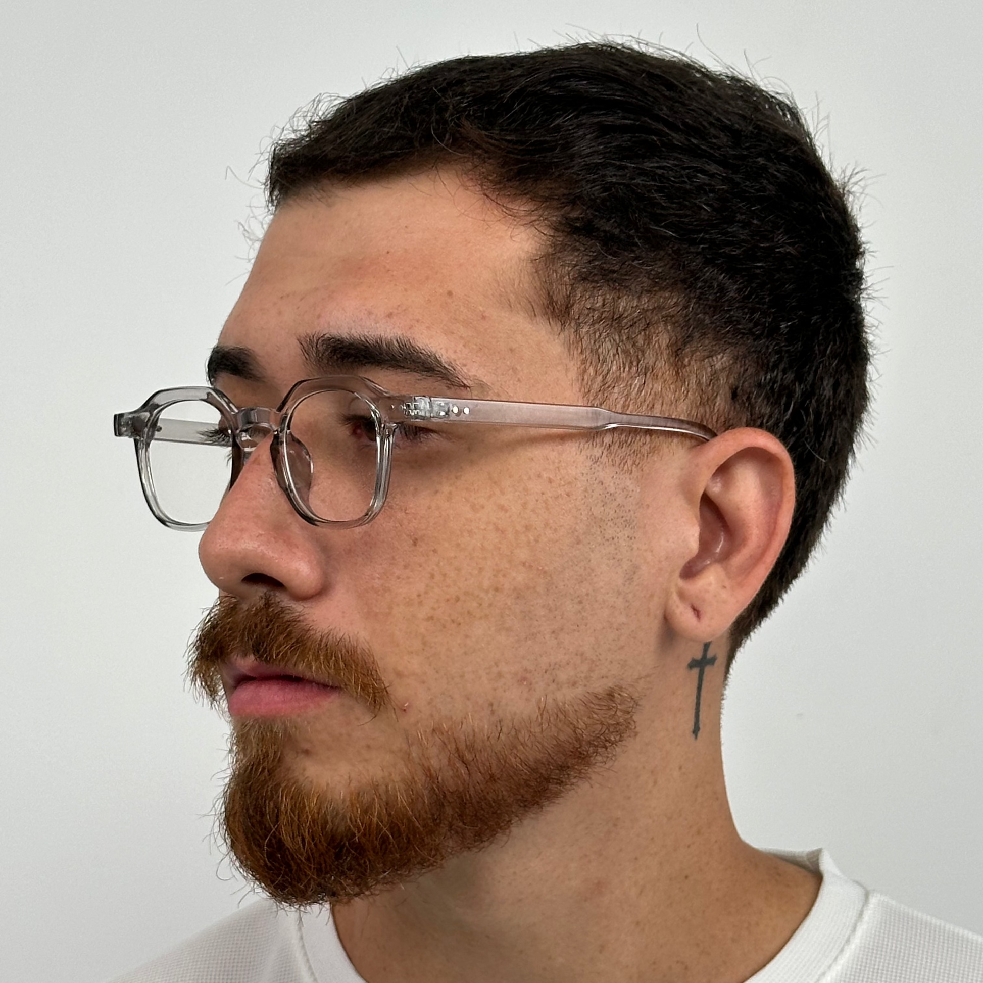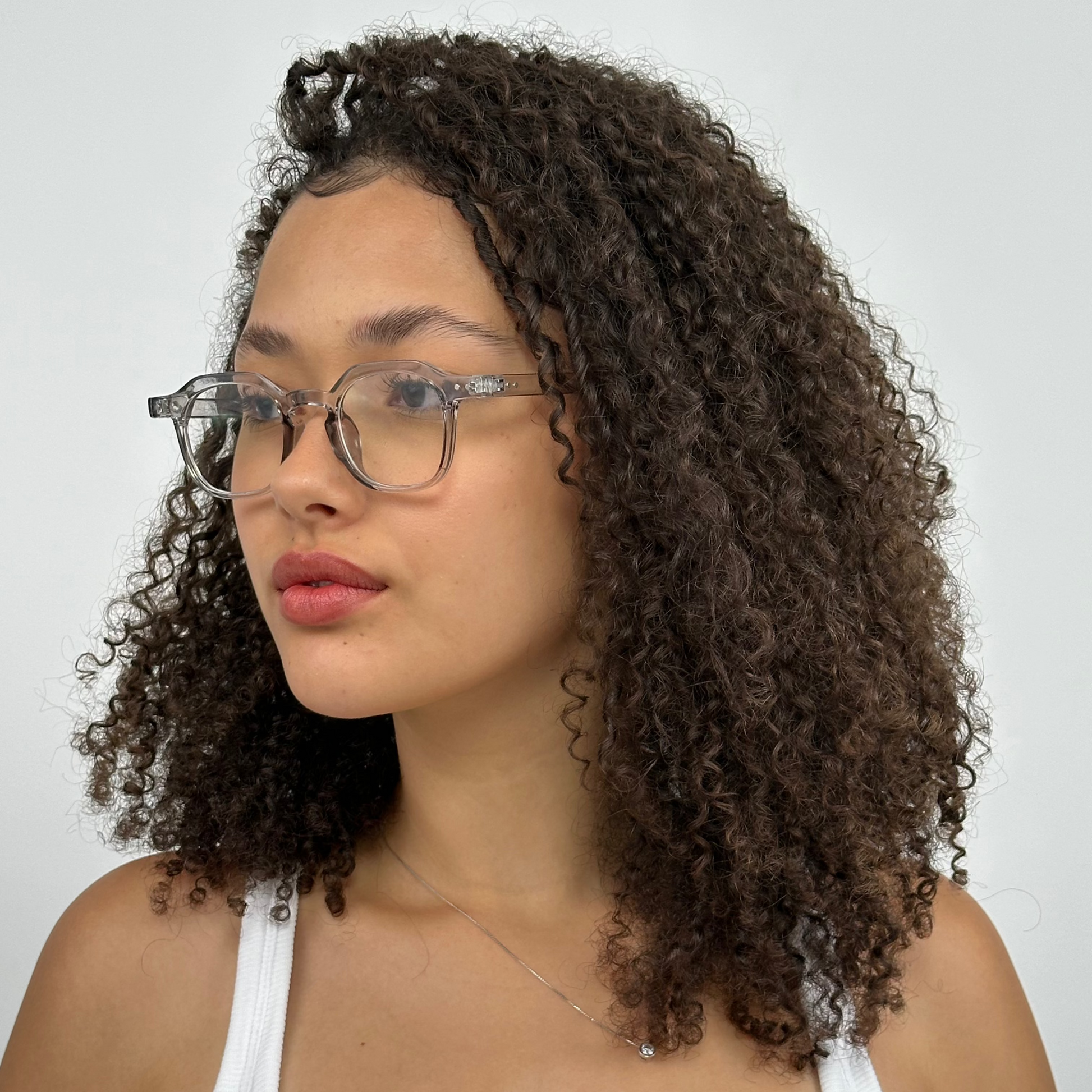 Este é um óculos de descanso com armação transparente, feita de policarbonato. Ele possui um design moderno e minimalista, com lentes arredondadas e hastes levemente grossas que acompanham a transparência do restante da armação. As ponteiras das hastes parecem ser confortáveis e o suporte nasal integrado proporciona leveza e praticidade para o uso no dia a dia. O estilo neutro combina com diferentes looks, tornando-o uma boa escolha tanto para uso casual quanto profissional.